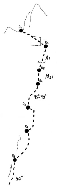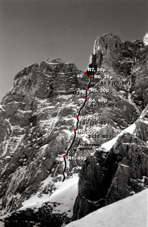 The ice conditions during both these efforts were phenomenal with regard to the usual Greek reality until then. Return is possible by the permanent anchors R7 - R6 - R5 - R4 - R3 as well as by a sling tied on a rock knob between anchors R2 and R1, on the right side of the route. In order to climb the route, pitons, nuts, friends, carabiners, slings and ice screws are required.