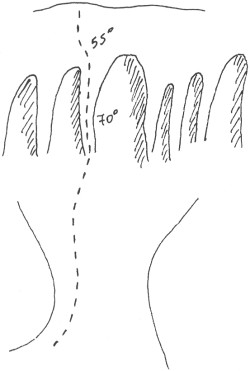 All the difficulties of the route are found in the last 150m, the first 80m of which present an inclination of 55° - 60°, while the next 10m an inclination of 80°. Finally, the inclination of the last 40m is about 60° - 65°.