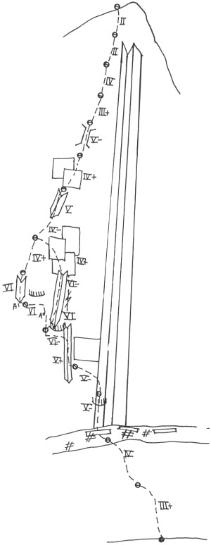 The first ascent of the route "Magnone - Antypa" (VI, 450m) was realized on 25-26/8/1960 by G. Magnone - S. Antypas in 12h. The line follows the central pillar of the Face.
