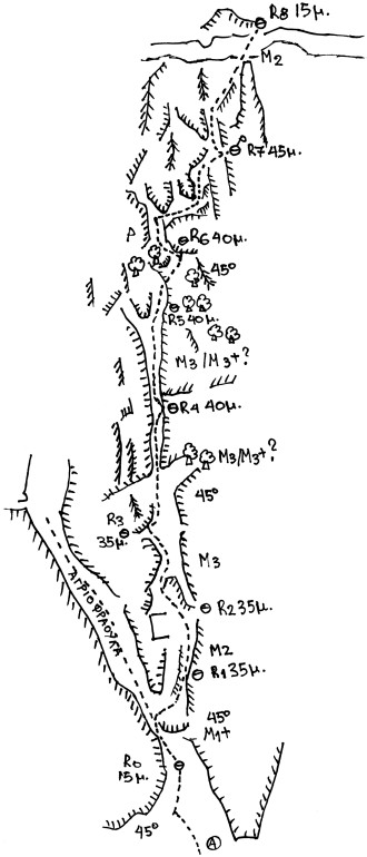The first ascent of the route "Nisteia" (45° M3, 300m) was realized in 2003 by T. Hatzisyrlis - S. Stamatiou.