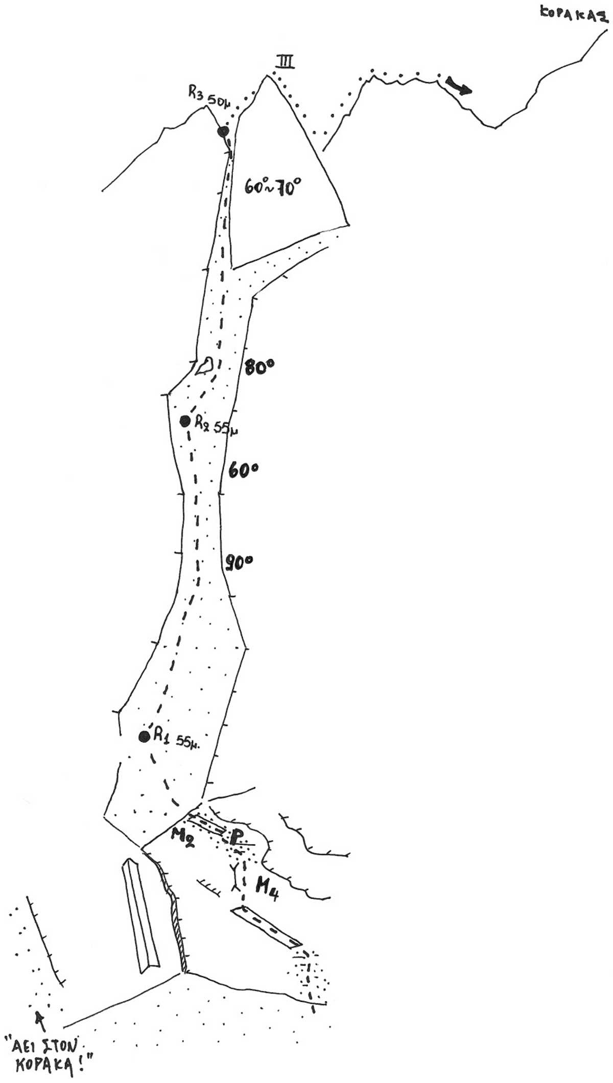 The first ascent of the route “Path of the guides” (III+ 4 M4, 160m) was realized on 27/3/2008 by G. Petromianos - A. Exakoidis - A. Boskos - G. Voutyropoulos.