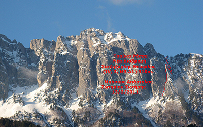 The first ascent of the route "Theofilos Chatzisyrlis" (IV 3 M3 A1, 310m) was realized on 13/2/2011 by A. Boskos - S. Sotiris.